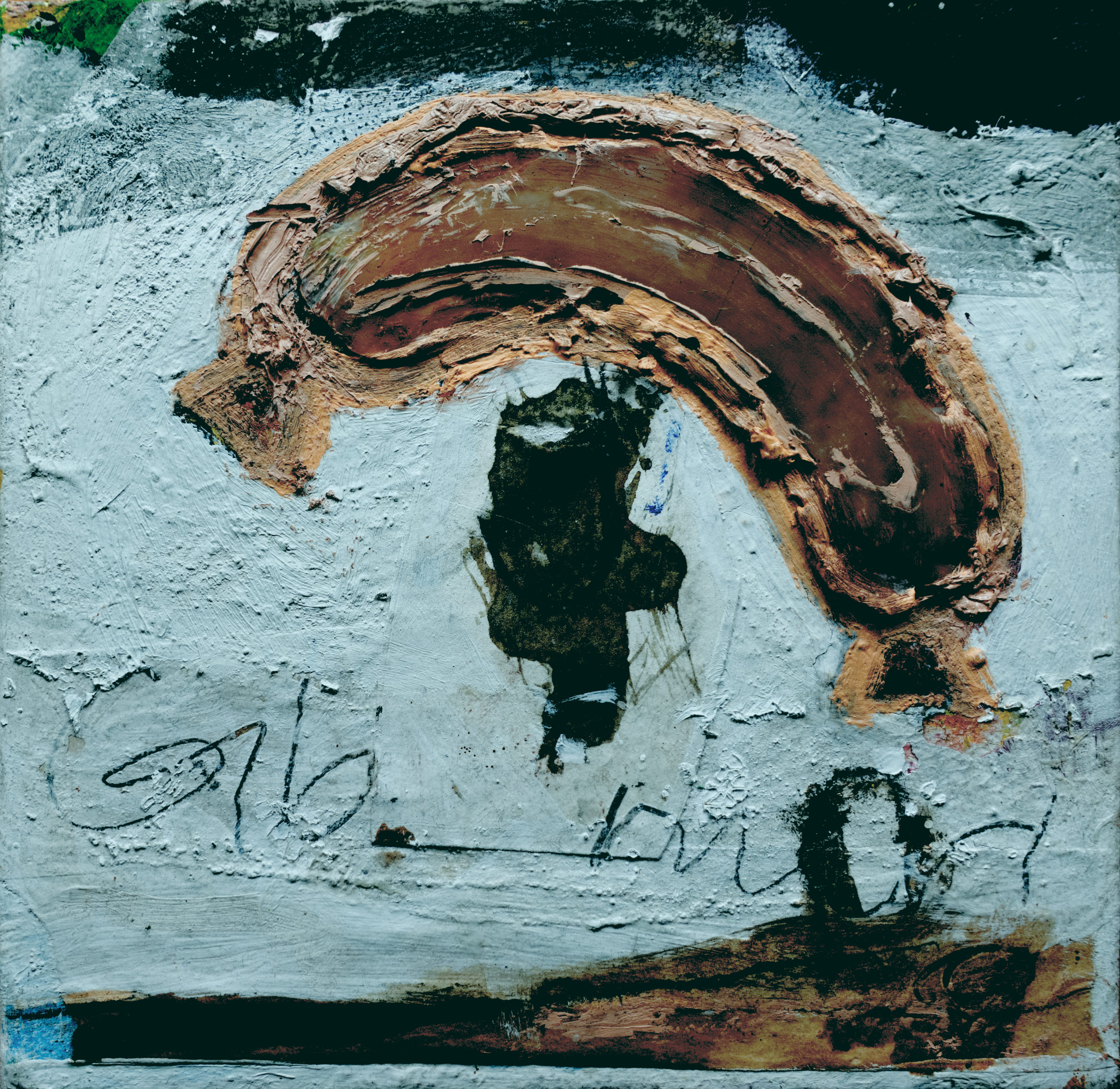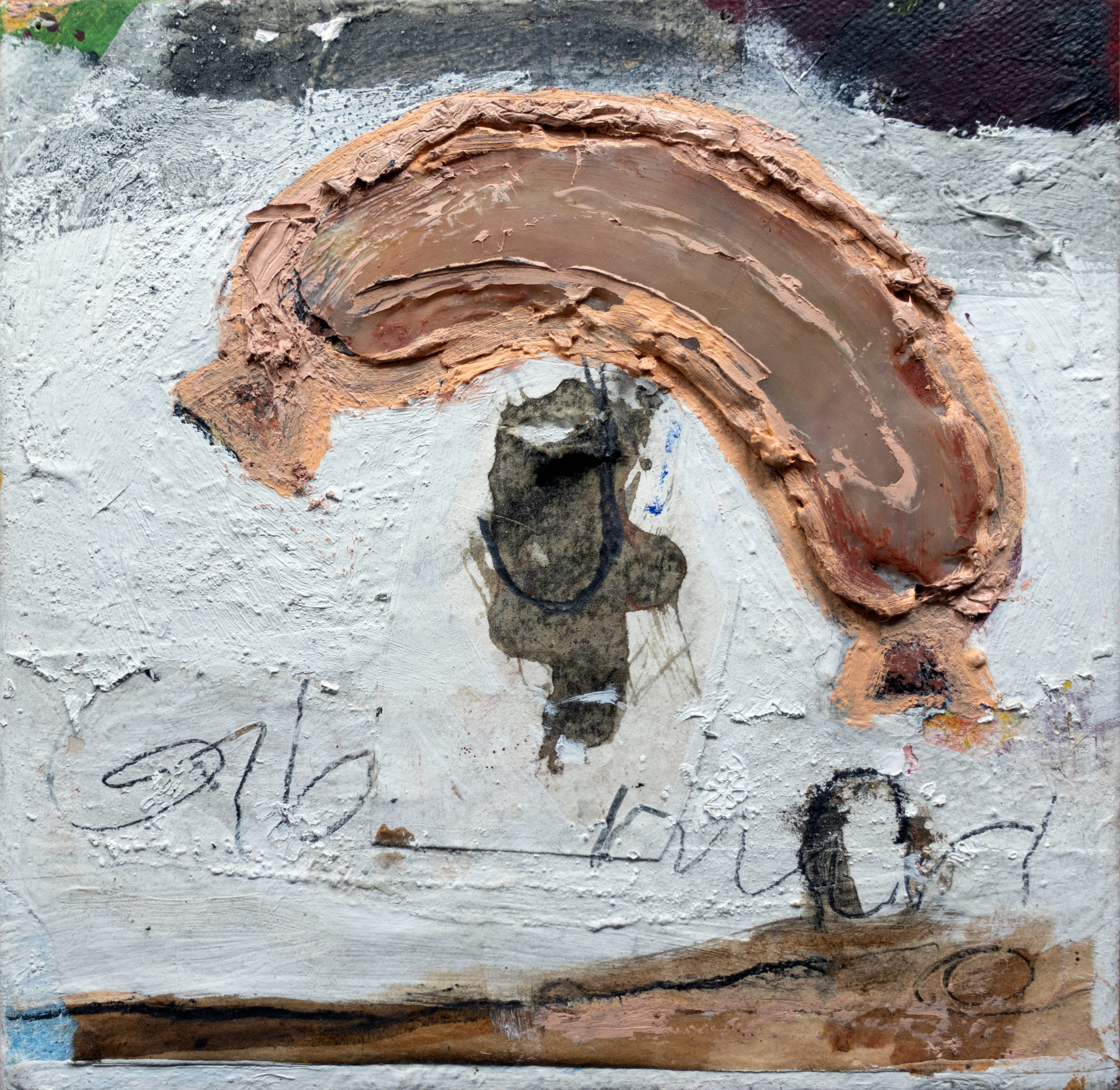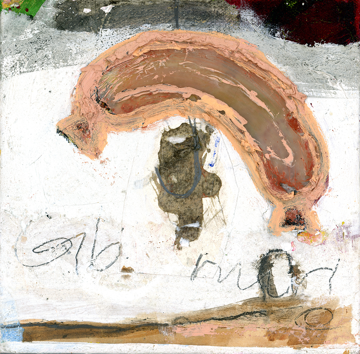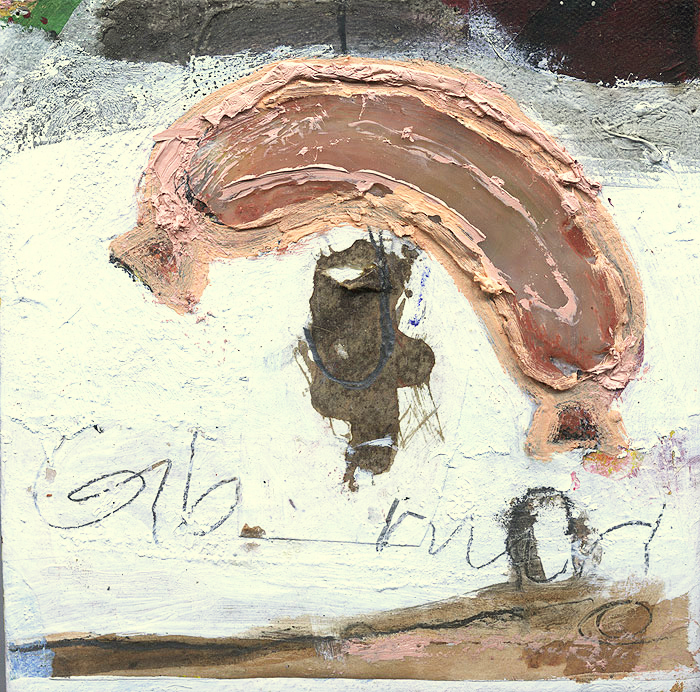 Gib mir Sahne ist eine Malerei mit deutlicher Struktur auf einem 20 cm x 20 cm Keilrahmen. Begegnung ist eine Malerei mit etwas Goldfarbe auf A3 Büttenpapier.